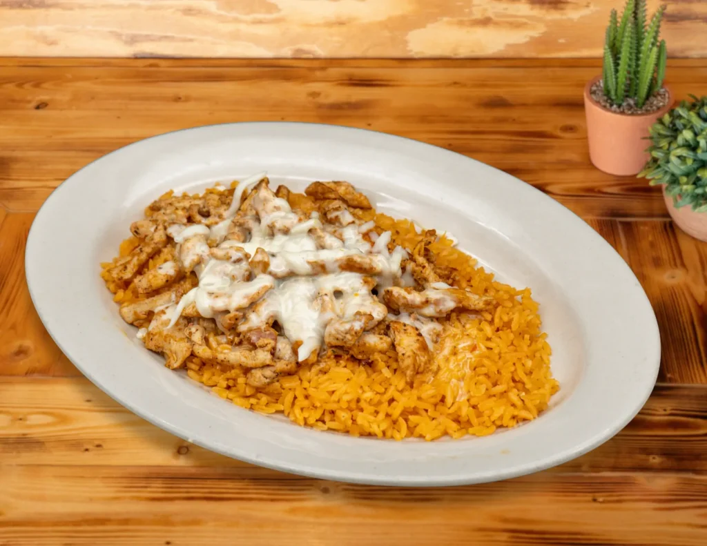 Grilled chicken strips, grilled tomatoes and onions topped with melted white cheese sauce and a side of rice.