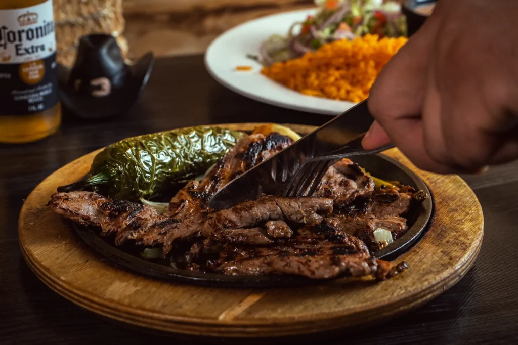 A succulent grilled beef steak, chile toreado with grilled onions, served with rice, beans, lettuce, pico de gallo, sour cream and tortillas.