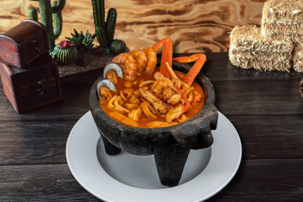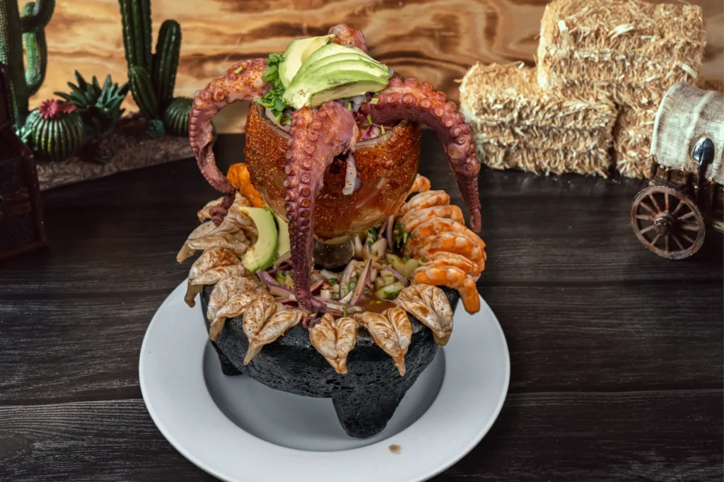 A cold volcanic bowl stuffed with lime cured shrimp, boiled shrimp, octopus, langostinos and mussel, topped with cucumber, onions, cilantro, celery and avocado slices (spicy).