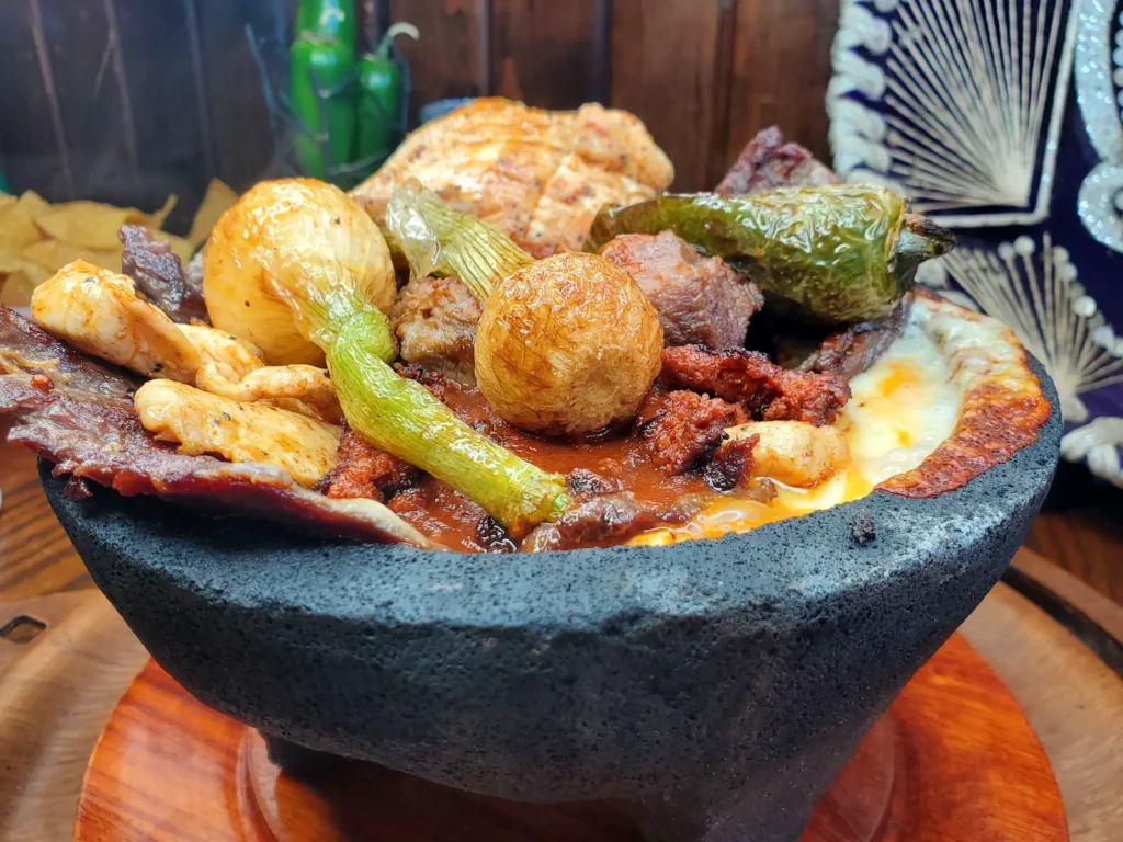 A hot volcanic bowl stuffed with grilled steak, chicken breast, carnitas, chorizo, jalapeƱo pepper and muenster cheese.