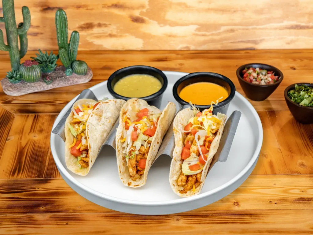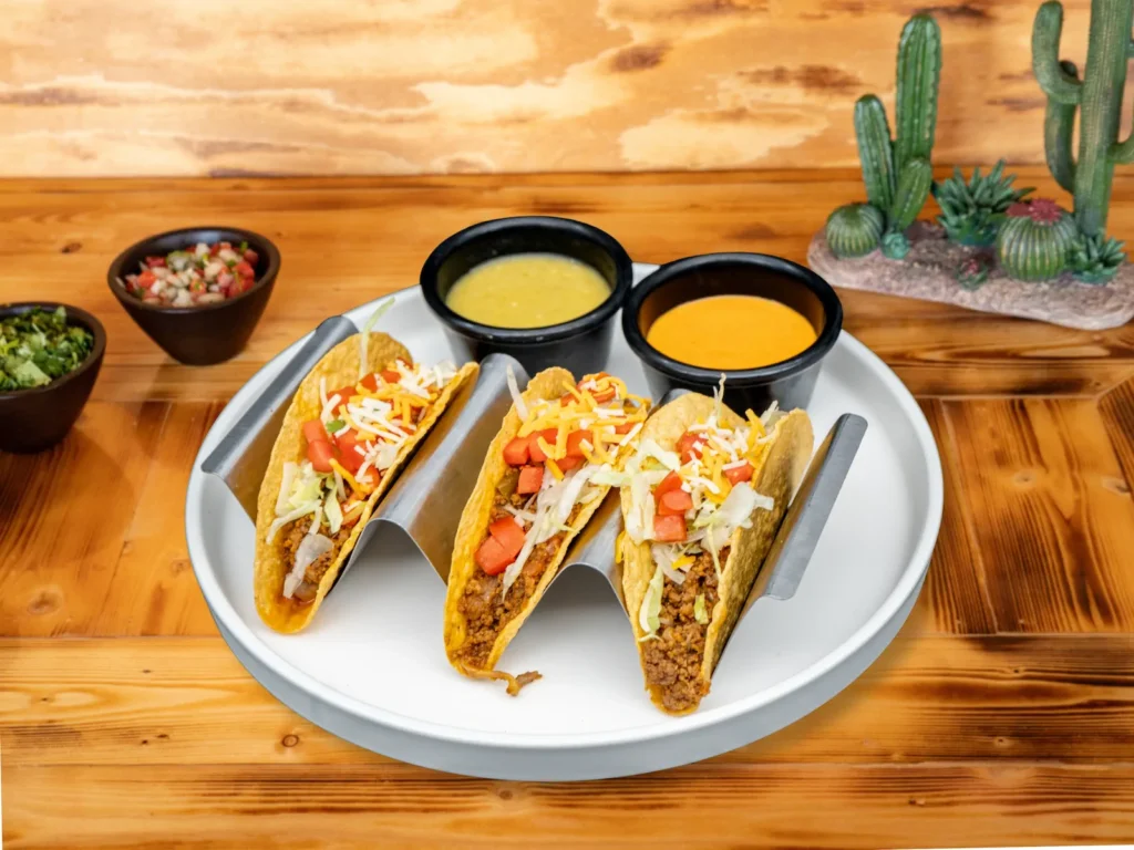 1 crispy corn tortilla stuffed with your choice of shredded chicken or ground beef, topped with lettuce and cheese.